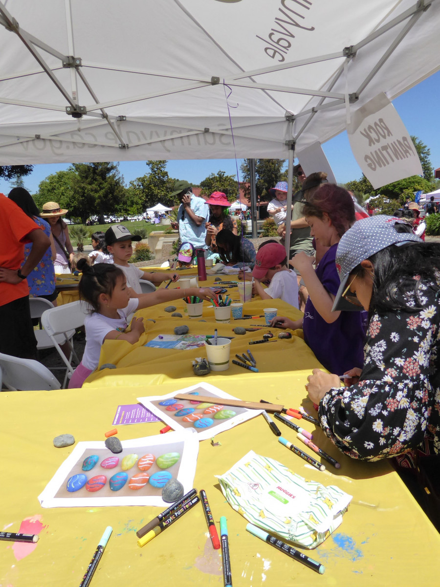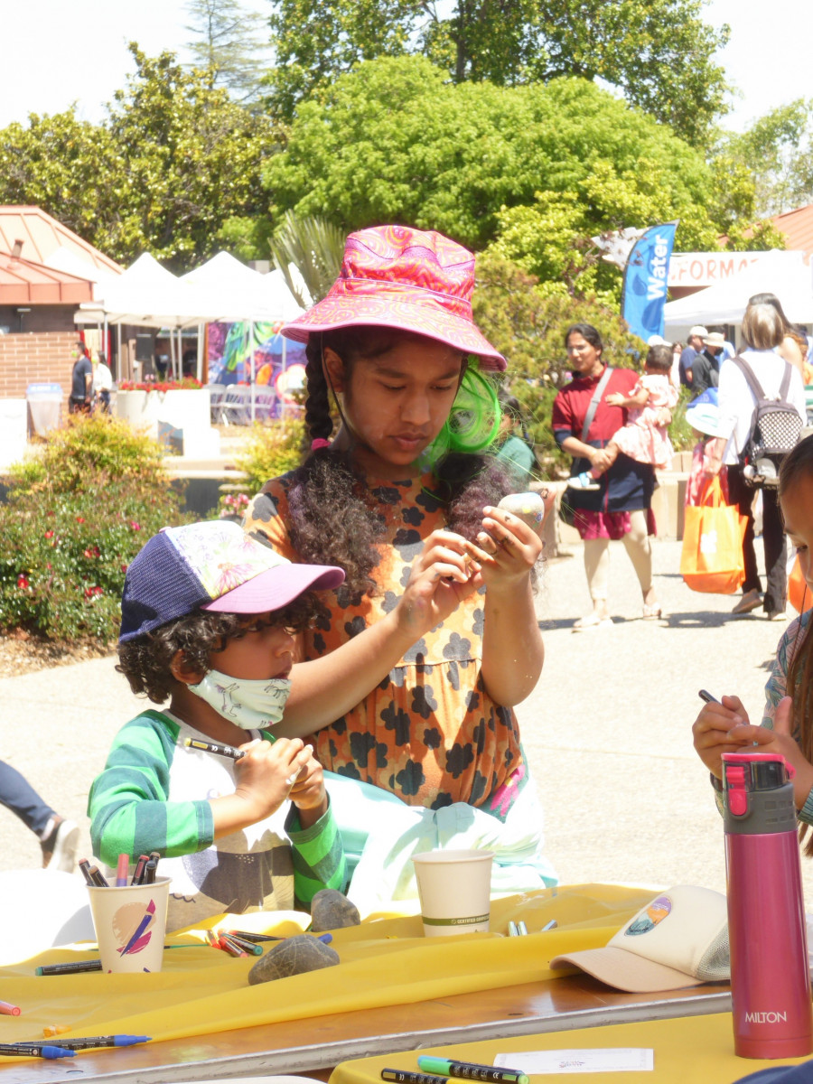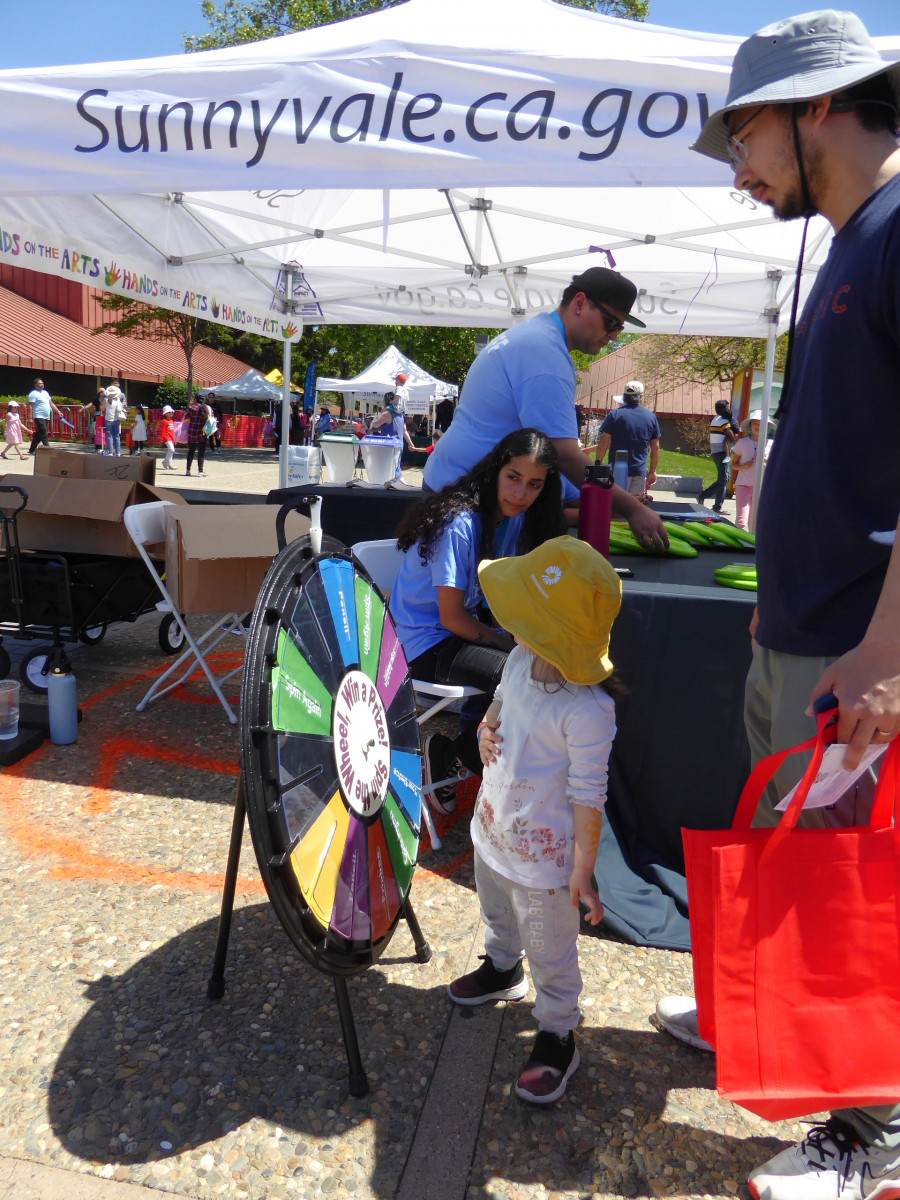 The hands-on art activities took place outdoors, spread over the Sunnyvale Community Center’s recreation campus at 550 E. Remington Dr. Thirty-seven booths provided art projects appropriate for 2 to 14-year-olds, who lined up to make paper collage robots, origami, sea glass creations, slime art (honest), Mexican Day of the Dead masks, and on and on.