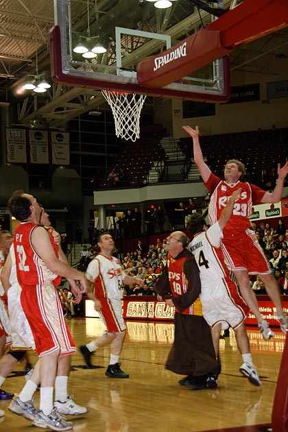 Families and individuals filled Santa Clara University’s Leavey Center on February 4 carrying signs to root on their favorite basketball player and those who were undecided could pick up a pre-printed bright yellow sign and join in the cheers. The players, who wore red and white jerseys, were eager to battle each other, but the basketball teams weren’t from Santa Clara University or another member of the West Coast Conference and the fans weren’t typical college students. Instead, the players were priests and seminarians, the fans were parishioners of various churches throughout the Bay Area, and the match up was the 5th Annual Priests Versus Seminarians Basketball Challenge put on by the Diocese of San Jose.