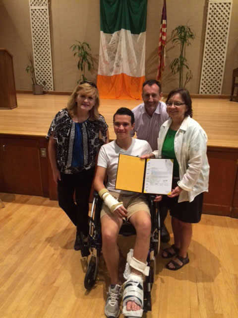 At 5:00 PM on Wednesday, the three Irish students and their families arrived at the Senior Center with over 100 doctors, nurses and caregivers from Eden Medical Center, John Muir Medical Center, Stanford Hospital and VMC. Also in attendance were Irish Consul General, Philip Grant and Vice Consul, Kevin Byrne, as well as the hardworking members of the IIPC and Father Brendan McBride who assisted the families and helped with their insurance and hospital needs, coordinating travels back and forth to Ireland and so much more. After dinner, Irish Consul General, Philip Grant, expressed his thanks to the IIPC and all of the medical staffs who have worked tirelessly with the students in their recovery. He also expressed his thanks to the City of Santa Clara and Santa Clara Sister Cities for providing a location for the event on such short notice. One of the students, Niall Murray, spoke for the students to express their appreciation for all of the support and how much they will miss their physical therapists. There were long goodbyes but it was evident that the students are anxious to get back to Ireland and continue their recoveries and be with the families and friends again. No doubt this will help with their healing process