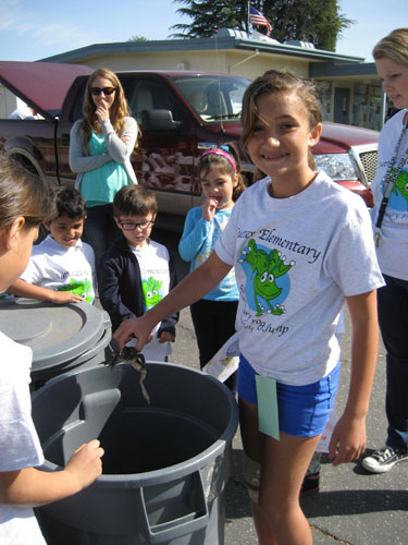“Three of us went out at night and caught them in Los Banos area,” says retired Sutter teacher Bill Guzules. “They came from a pond and five irrigation canals.” One person shines a light and the other two are catchers. Except for some smaller frogs for the kindergarteners, each frog they kept measured the minimum legal length of four inches, nose to tail.