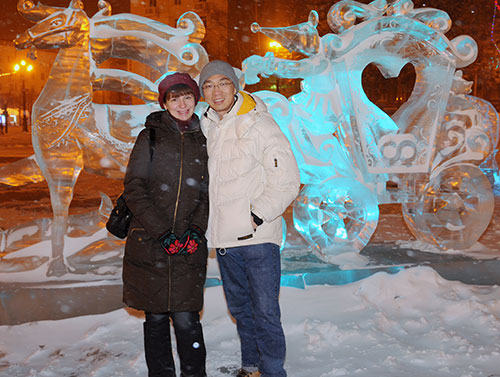 At midnight the president spoke on TV. Families watched a famous Russian comedy movie or went to parties, not getting to bed until 4 or 5 a.m. Sometimes Baykova’s family went for a walk in the cold night (-22 degrees F.) and viewed ice sculptures carved by Russian and neighboring Chinese ice sculptors.