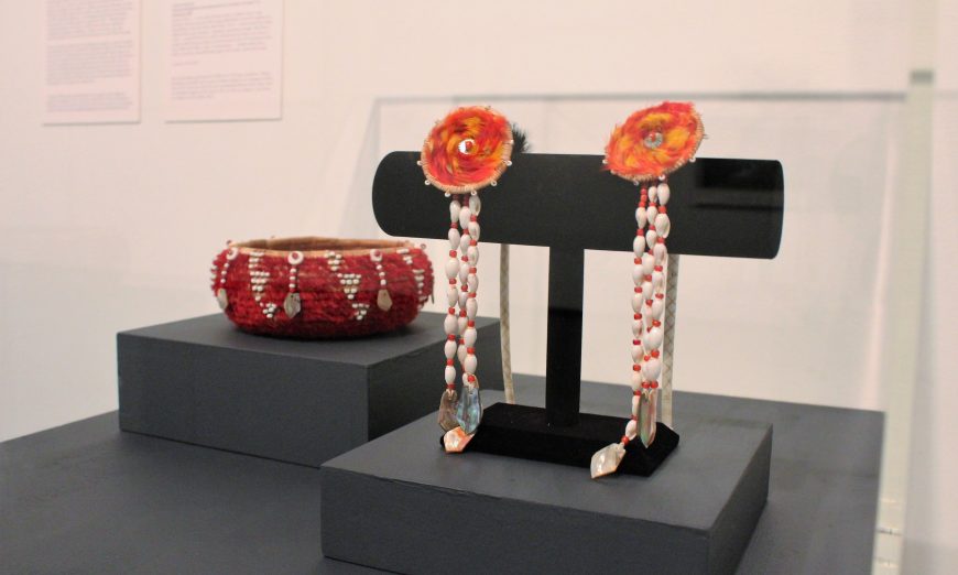 “Linda is known for her work revitalizing Ohlone basketry,” Baines said and shared details about Yamane’s “Ohlone Basketry Ear Ornaments” (“Tiprin Tuupen” in Rumsen). “The ear ornaments are her work but based on artifacts. There are a pair of ear ornaments that are historical and date back to the 1800s to the area of Santa Clara. It ended up in collections in London and Berlin. Linda studied those historical ear ornaments and recreated them. She taught herself how to prepare and source the materials and how to weave the materials.”