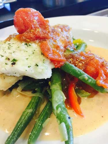 The menu changes daily and is always cooked from scratch using all fresh ingredients supplied by local farms whenever possible. Menus depend on what’s available,” says Kresge. “It’s important to keep the farm-to-table [connection]. As chefs, it’s our duty to give that message to consumers.”