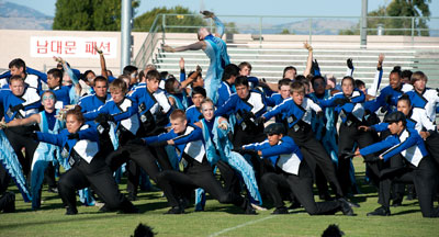 The Anthem got the show started. What followed was a dazzling display of precision that could best be described as “organized pandemonium.” Upwards of 150 people per team appeared on the field, as each team had individual sections – brass, color guard, and percussion – performing different routines as part of each team‘s competition entry. Focus your eyes on one part of the field for too long and you would miss the action taking place somewhere else. Flags, swords, and rifles were tossed and spun in the air. Huge sheets of fabric became moving canopies by the color guard, who also performed many intricate routines, including gymnastics, all while musical numbers were played by the percussion (instruments that are carried such as smaller drums and cymbals, and stationary instruments including electronic pianos, bells, bongos, xylophone, larger bass drums, etc.) and brass (any sort of wind instrument).