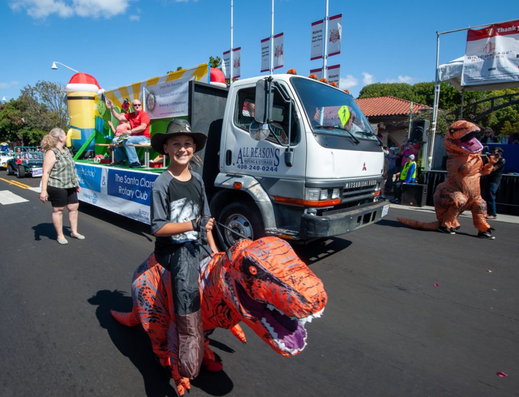 San Jose resident Lucas (11) managed to wrangle a T-Rex for his ride in the parade with the Santa Clara Rotary Float