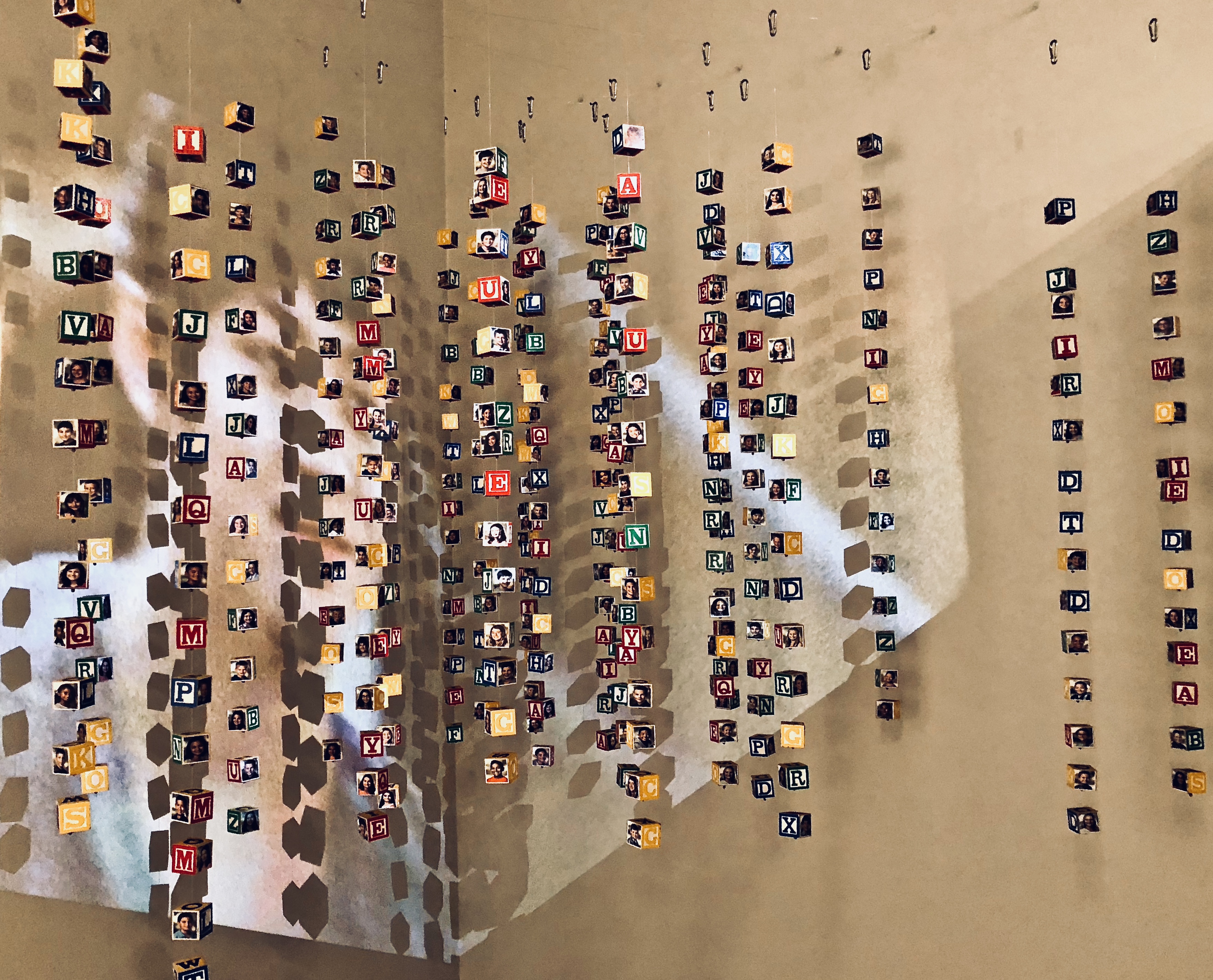 Prey is made up of 350 children’s wooden alphabet blocks, each with the photo of a child on it, symbolizing an innocent childhood potentially stolen through trafficking. Backed into a gallery corner, like a trapped child, the blocks dangle from overhead lines like mobiles. Fifteen blocks are attached to each of the more than 20 vertical lines that hang along two adjacent walls, meeting in the corner.