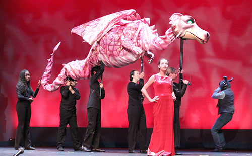 “The cast members put the harnesses on and there are poles they can hold onto while lifting the dragon,” Brady says. “Those poles go into the harnesses. It took some practice putting it together.”