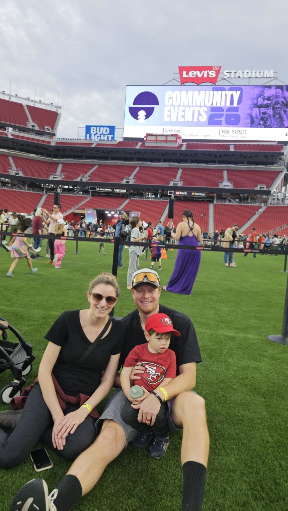 Native Californians Leanne and Calvin Schumacher live a ten-minute walk away. They were sitting with their two-year-old son on the turf in the middle of the field, resting and watching the action around them—from tug-of-war to frisbee. They previously attended a 49ers game and Taylor Swift and Beyoncé concerts.