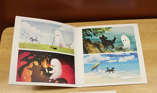Not all of the featured art in the exhibit were mounted on the wall. An art book set on a small table belongs to senior Renee Prescilla. Her book, “Ghost and Dog,” shows the daily speedpaints of the two companions.