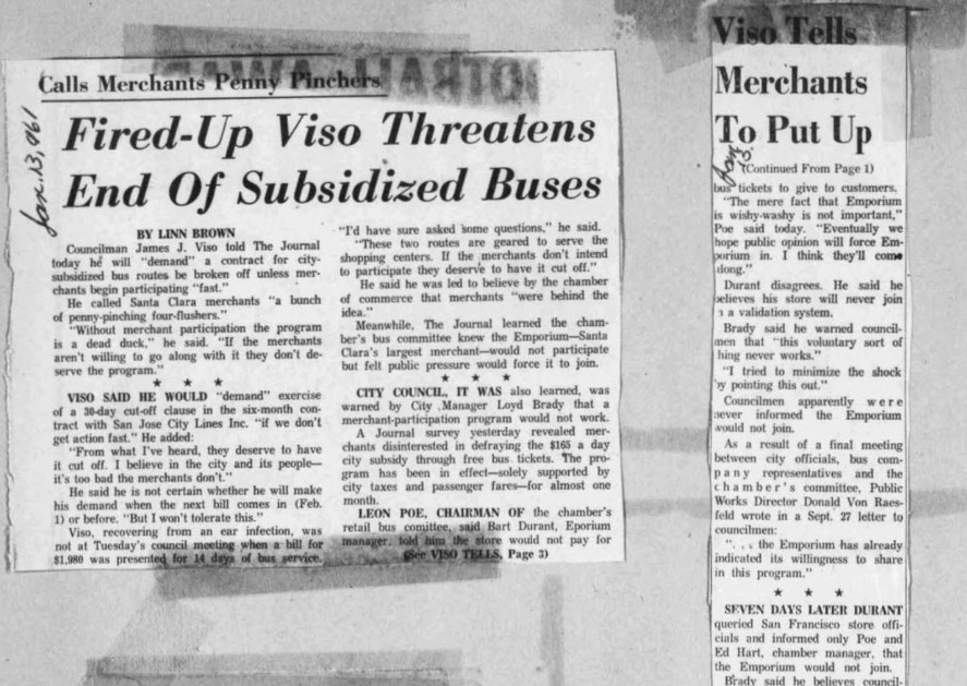 From the start the enthusiasm of the intended beneficiaries of the bus system — retailers — notably cooled when they were asked to share the costs as well. In January 1961, the Journal reported that, “A survey of Santa Clara merchants today revealed apathy and disinterest in helping to support two new bus lines here.”