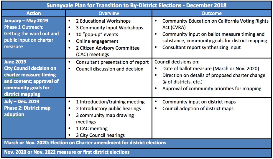In early September, the Sunnyvale Council held a public hearing about changing from the current at-large, by-seat election system for electing Council members to a by-district system and began work on a transition plan, hiring public outreach consultant, PlaceWorks Inc., to assist the City. The Citizens Advisory Committee (CAC) will be appointed by the new Council when it is seated in January.