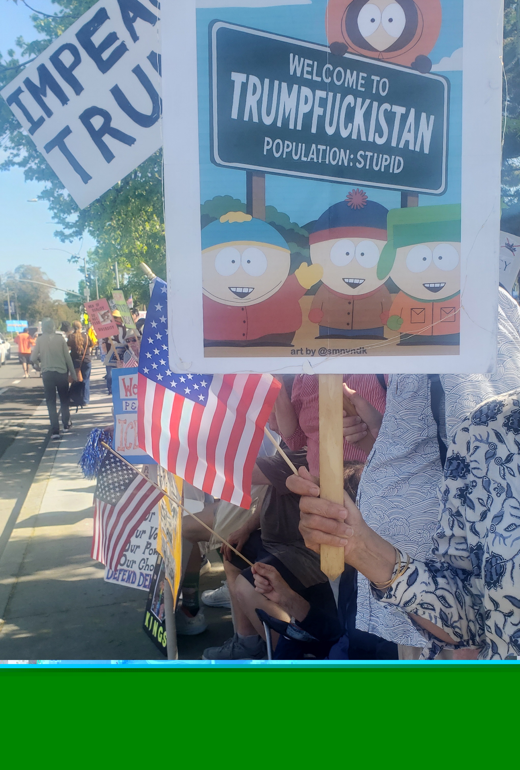 The day wouldn’t be complete without the whimsy that’s now become a signature of anti-Trump demonstrations. Creative signs included “You can’t bomb your way out of the Epstein files,” and “Let me guess: Barron has bone spurs.” And of course, there were several costumed frogs adding to the party atmosphere.*