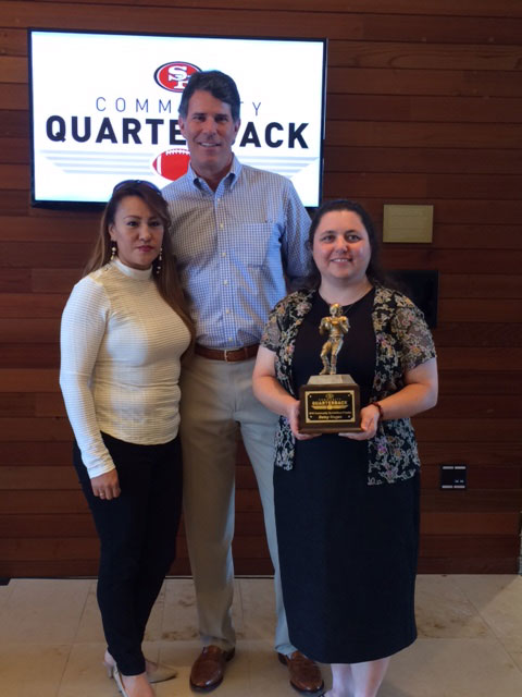 Betsy Megas, former library trustee board member and current literacy volunteer for Read Santa Clara, was a finalist for the 49ers Community Quarterback Award. Nominated by the Santa Clara City Library Foundation and Friends, Megas was a guest at a Sept. 21 luncheon, also attended by former San Francisco 49ers quarterback Steve Bono. Here, Megas received a large trophy depicting a football player and the library foundation received $1,000, to be used to support Read Santa Clara. During an Oct. 2 pre-game at Levi’s Stadium, Megas and the other award winners were publicly recognized at the 50-yard line.