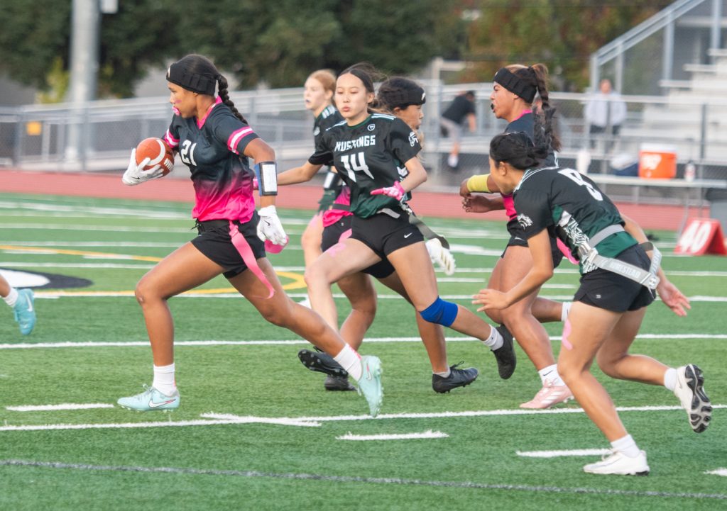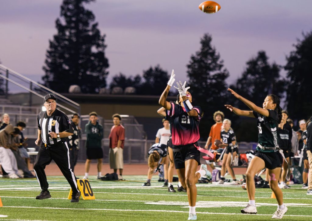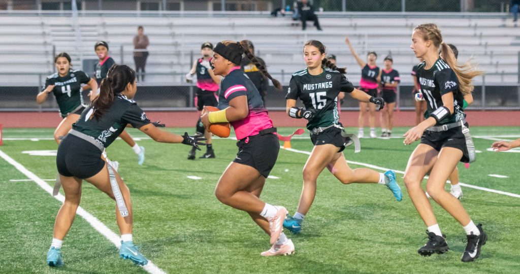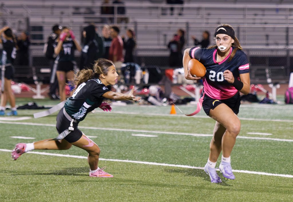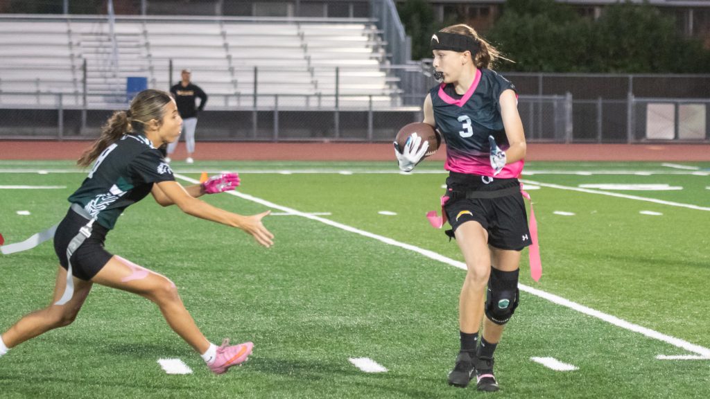 “I had no idea flag football was even a thing,” joked senior Nathalie Gonzalez on joining the team for last year’s inaugural season. “A friend kind of dragged me from track training to join. I didn’t think I was going to like it, but turns out there is nowhere else I would rather be. Flag football is definitely my sport. I’m really happy with the friends that I have met and the environment that this sport brings. There are some girls I probably wouldn’t have ever talked to until we started flag football. With that, I know have more people to say hi to in the halls. It creates so much bigger of a community than I would have had without it.”